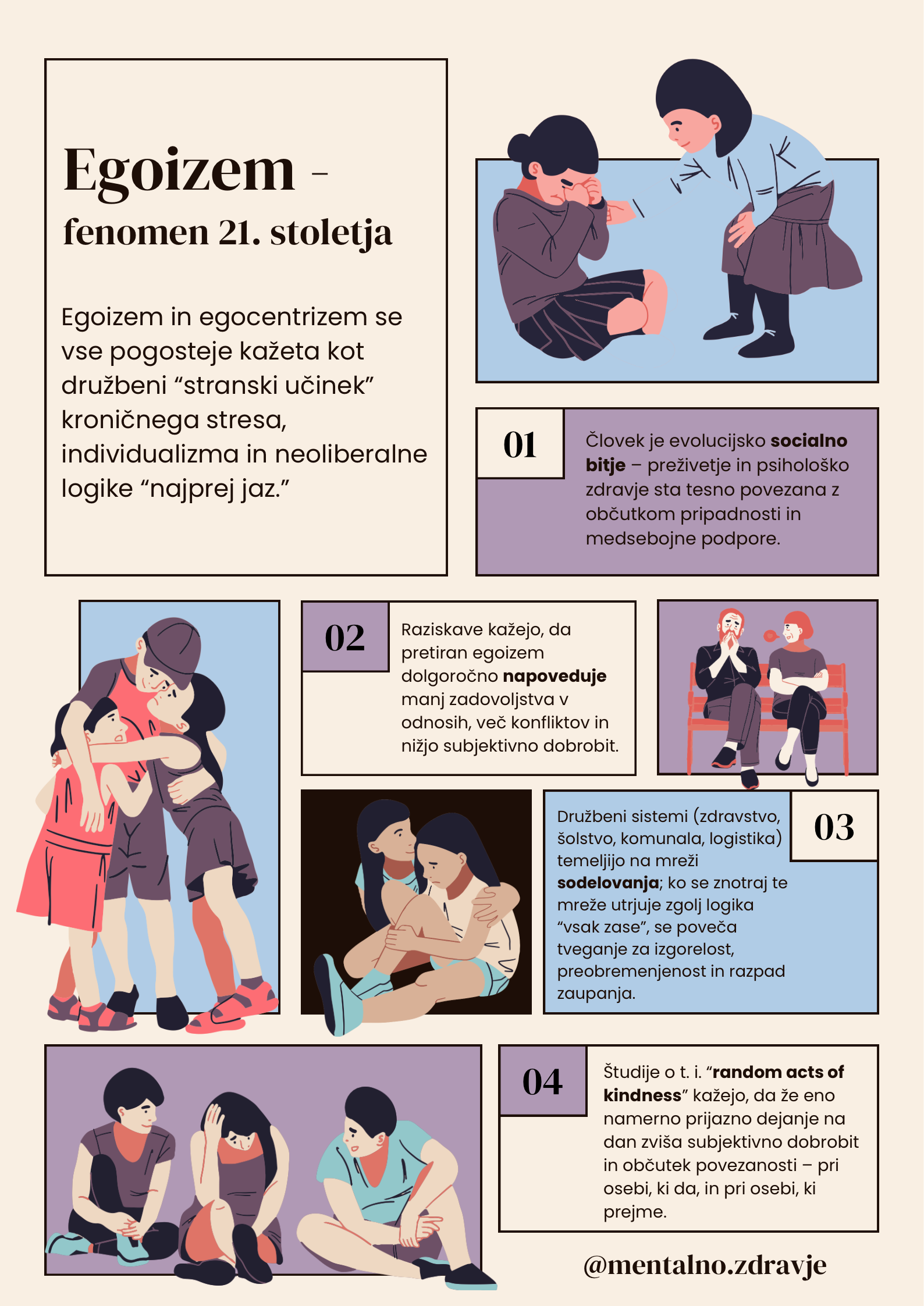 egoizem je postal ena izmed "tihih" bolezni 21. stoletja. Gibanje “jaz na prvem mestu”, ki se je rodilo kot nujen odgovor na izgorelost, kronični stres in pritiske kapitalizma, se je vmes prevesilo v nekaj drugega – v egocentričnost, ki vse prevečkrat reže mostove med nami, namesto da bi jih gradila.